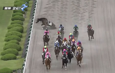 北村友騎手は起き上がれず、担架で搬送されました。