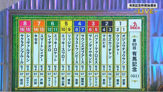 23日に中山競馬場で行われる、第63回有馬記念(3歳上・GI・芝2500m・1着賞金3億円)の枠順が20日確定した。