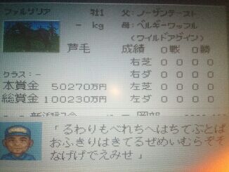 今回は売却価格7600万の馬がパスを打ち込むと売却価格3200万になって、母の値段や気性や勝負根性まで変動してたから、色々謎だったよ