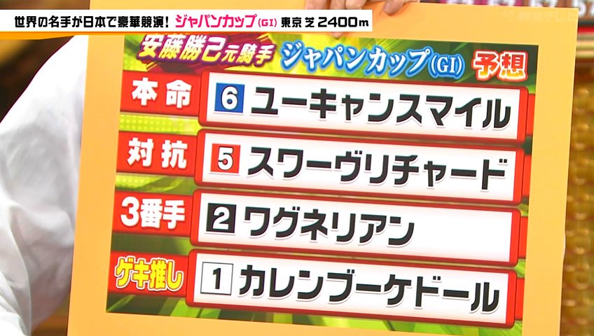 ジャパンCサイン① 今週結婚した芸能人 壇蜜→ダンビュライト 安藤なつ→アンカツのご指名馬→ユーキャンスマイル この2頭だと配当大きそう。 #ジャパンC予想