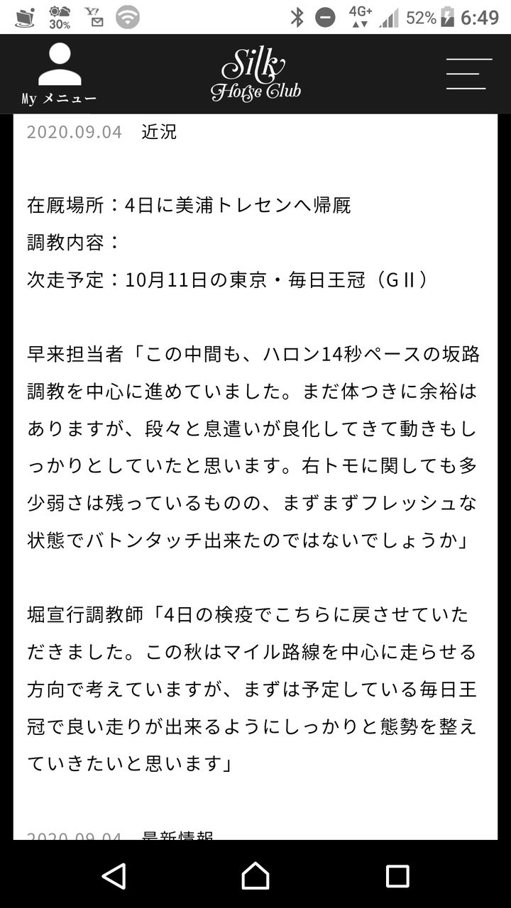 この秋はマイル路線を中心に走らせる方向で考えていますが、まずは予定している毎日王冠で良い走りが出来るようにしっかりと態勢を整えていきたいと思います」