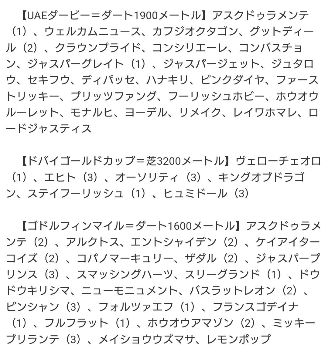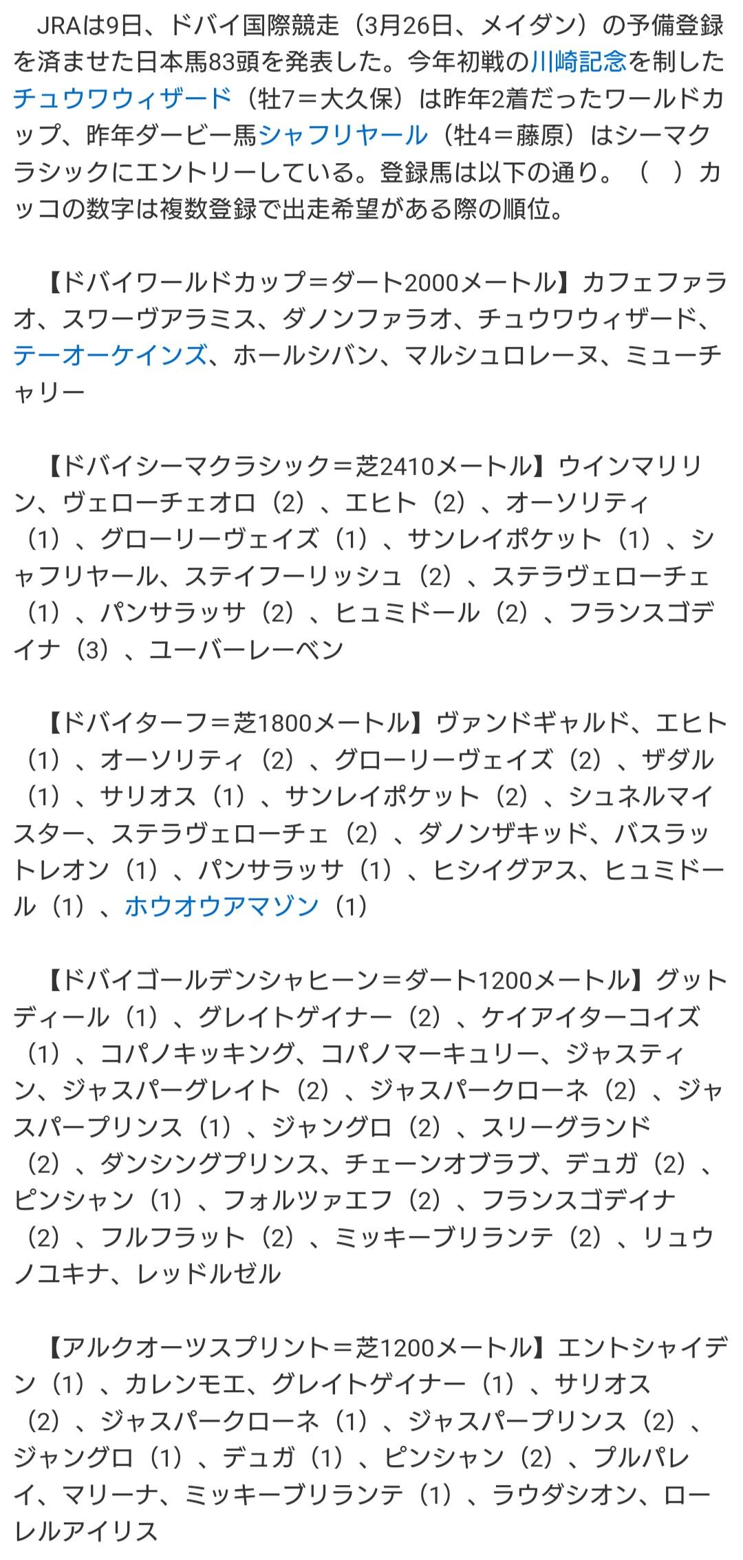 【ドバイ国際競走】チュウワウィザード、シャフリヤールなど日本馬83頭が予備登録
