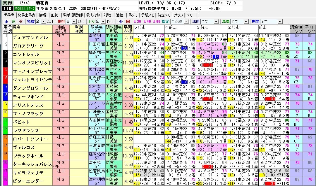 3000m戦だと無用の長物になるが、私が算出する菊花賞の指数表。コントレイル以外ほぼ全頭横並びに近く、それは秋華賞と似た構図。コントレイルの前走の値が今一つなのはnoteで書いたように楽走だったから。コントレイルの特性上あり得ないが、仮に他馬と同様に全開で走れば5馬身以上差が付くだろう。