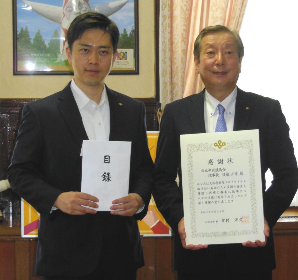 大阪府は24日、JRA(日本中央競馬会)からの「大阪府新型コロナウイルス助け合い基金」への寄付に対し、同会へ感謝状を贈呈した。