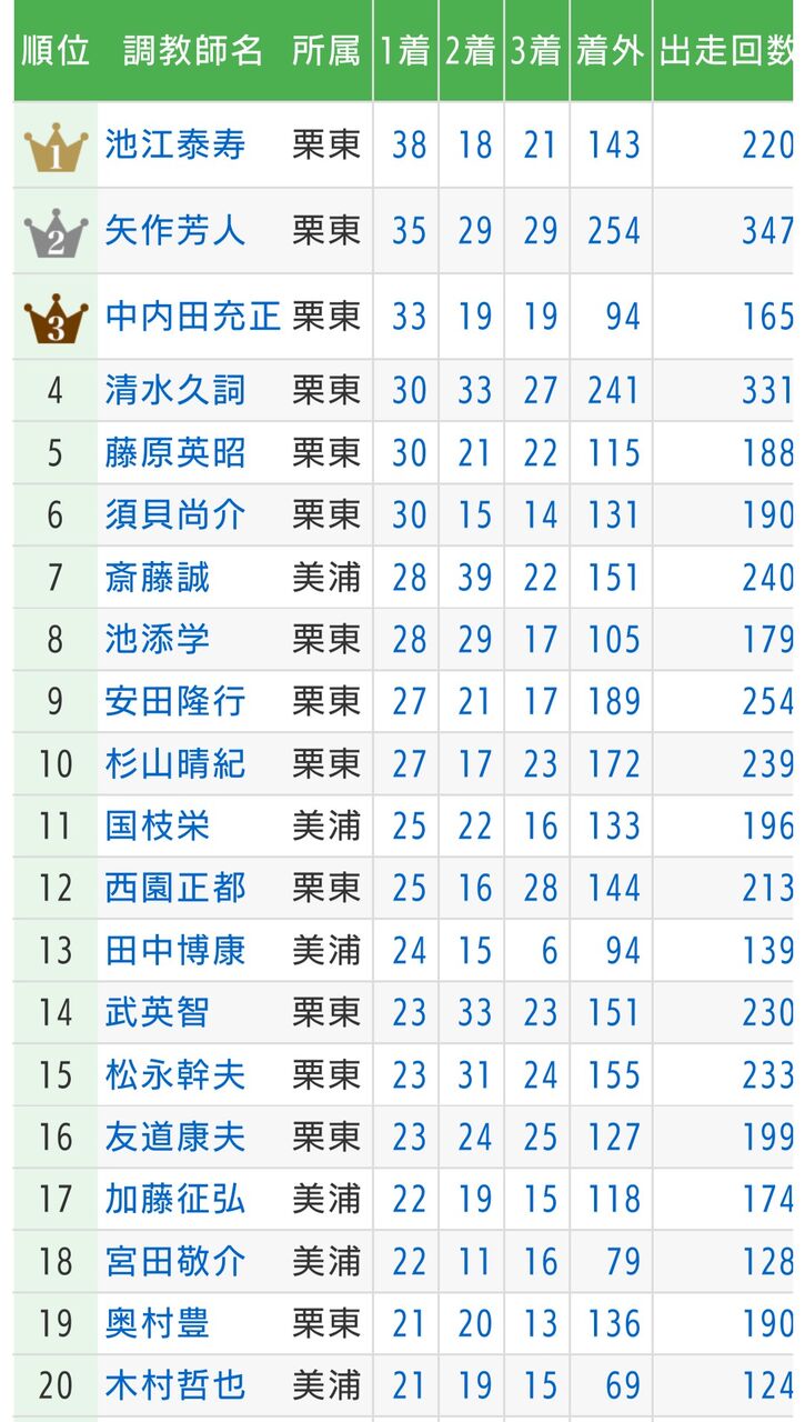 天栄ローテのキムテツがリーディング上位厩舎の中で馬房数も考えるとダントツで出走回数が少ないのがもうね