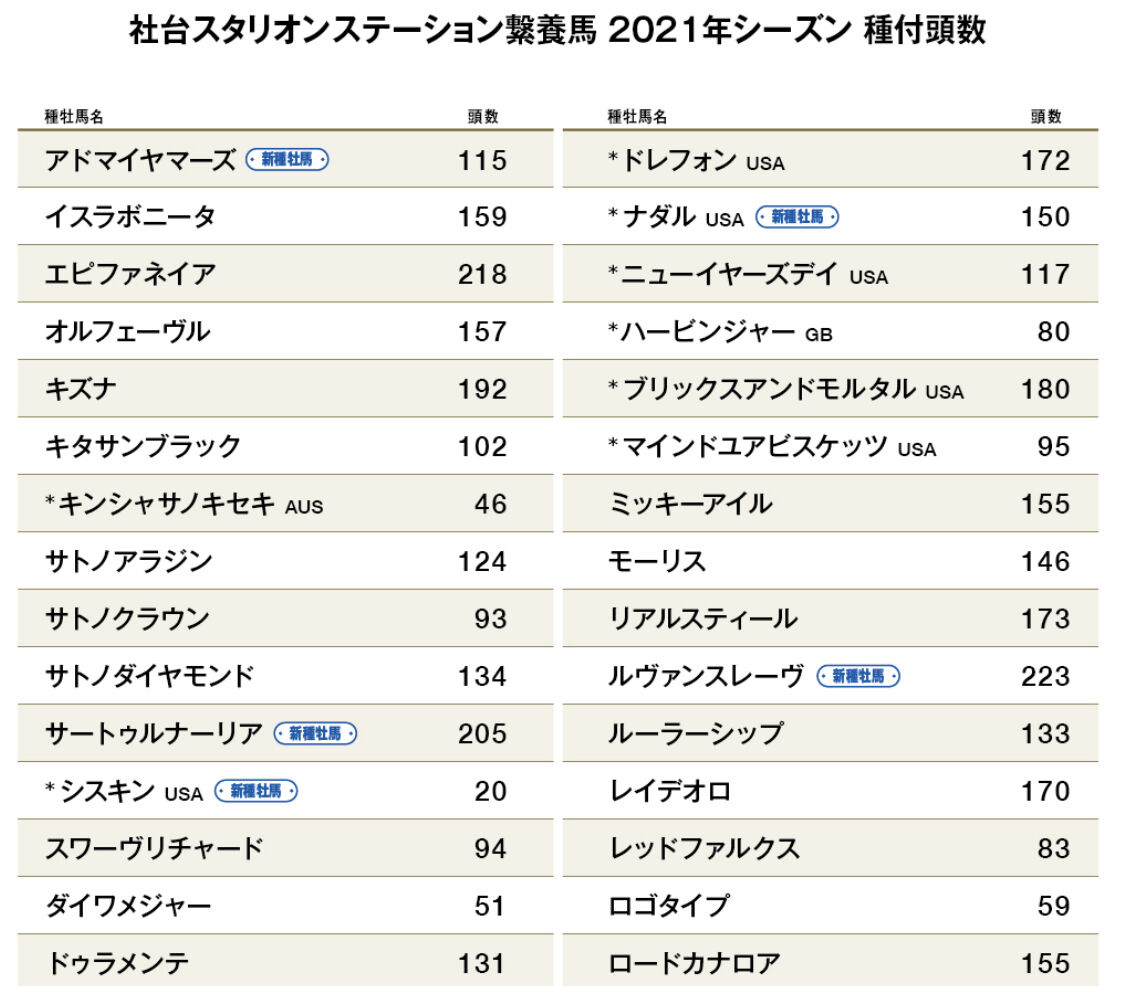 【競馬】社台種付頭数2021 ルヴァンスレーヴ223 エピファネイア218 サートゥルナーリア205