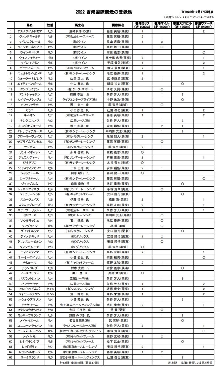 【競馬】香港国際に日本馬63頭が最終登録 ジャックドール、サリオス、ダノンベルーガ、ウォーターナビレラ等