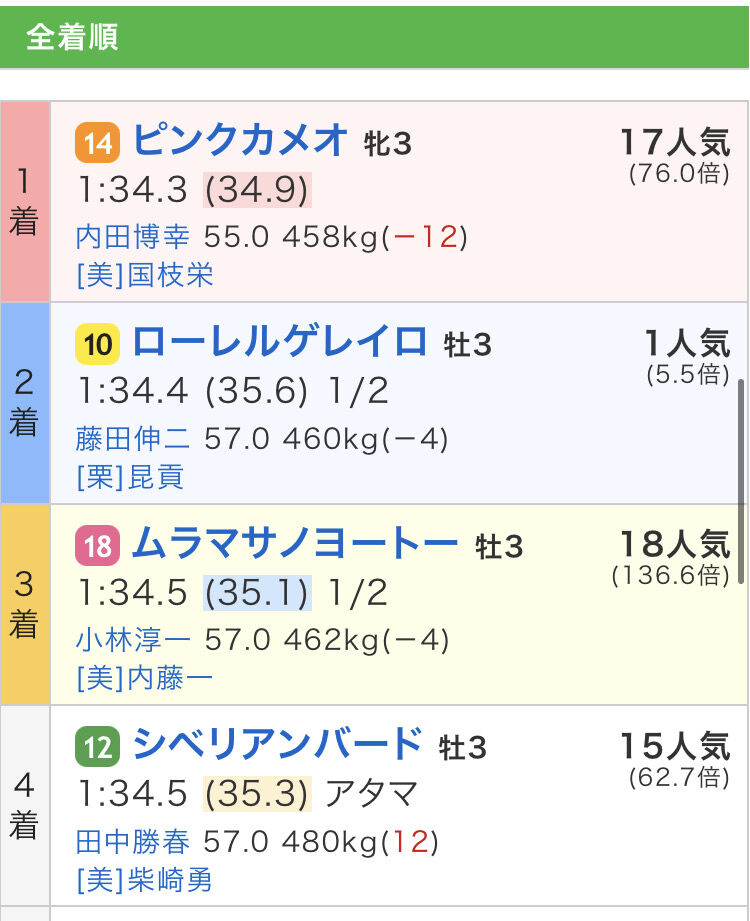 今年は荒れないと思って1番人気2番人気の二頭軸にしてたワイ有能