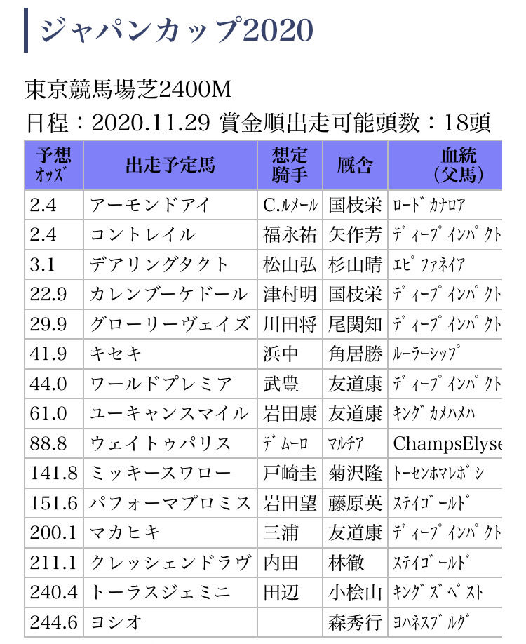 【競馬・ジャパンカップ】サートゥルナーリアが抜けた後の4番人気の馬がやべええええええ