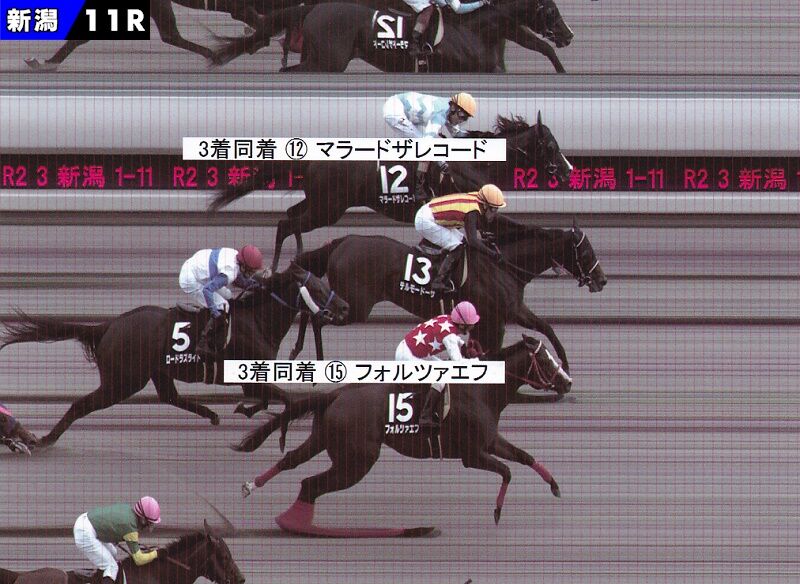 テレビのスロー再生で止まった映像はゴール板を過ぎた所でフォルツァエフとマラーザレコードのハナ面は同時に見えるが、ゴール板丁度の所ではマラーが先着してたはずだ。JRAホームページ写真でもマラーの白い鼻先の方が線にかかって見える。配当が半分になったわ