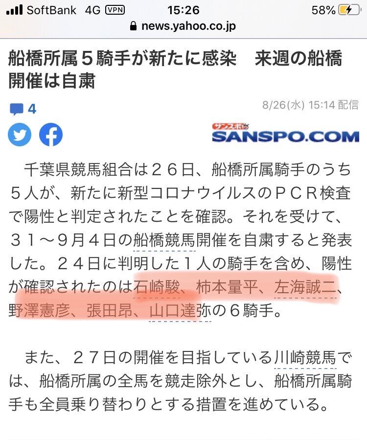 24日に判明した1人の騎手を含め、陽性が確認されたのは石崎駿、柿本量平、左海誠二、野澤憲彦、張田昂、山口達弥の6騎手。
