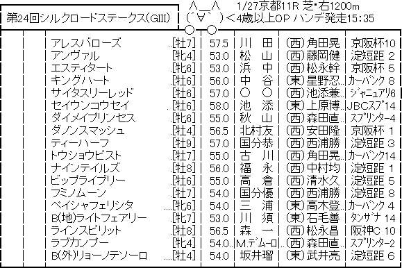2019.01.23 馬券予想・データkeiba umanami 【競馬予想】[1]第24回 シルクロードステークス(G3) /2019 ツイート シェア Google+ はてブ Pocket 256: 名無しさん@実況で競馬板アウト 2019/01/23(水) 17:07:57.14 ID:tKRjiGbk0 続きを読む Source: ☆うまなみ・競馬にゅーす速報 【競馬予想】[1]第24回 シルクロードステークス(G3) /2019