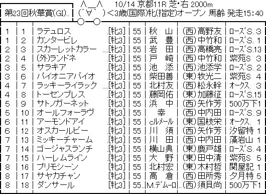 2018.10.13 馬券予想・データkeiba umanami 【競馬予想】[3]第23回 秋華賞(G1) /2018 ツイート シェア Google+ はてブ Pocket 1: 名無しさん@実況で競馬板アウト 2018/10/13(土) 08:36:25.40 ID:GqYnHjny0 枠 http://jra.jp/keiba/thisweek/2018/1014_1/syutsuba.html 続きを読む Source: ☆うまなみ・競馬にゅーす速報 【競馬予想】[3]第23回 秋華賞(G1) /2018
