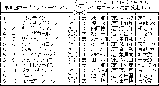 2018.12.27 馬券予想・データkeiba umanami 【競馬予想】[3]第35回 ホープフルステークス(G1) /2018 ツイート シェア Google+ はてブ Pocket 1: 名無しさん@実況で競馬板アウト 2018/12/26(水) 16:29:12.92 ID:P33Y+D9K0 枠 http://jra.jp/keiba/thisweek/2018/1228_1/syutsuba.html 続きを読む Source: ☆うまなみ・競馬にゅーす速報 【競馬予想】[3]第35回 ホープフルステークス(G1) /2018