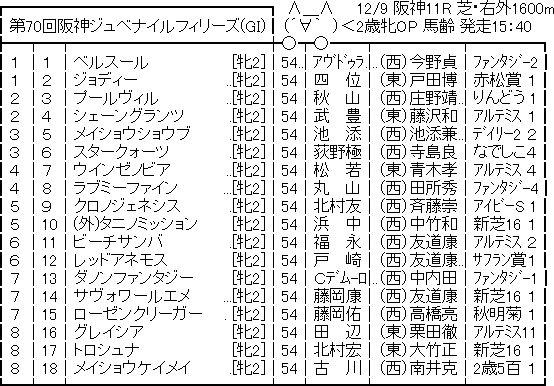 2018.12.08 馬券予想・データkeiba umanami 【競馬予想】[3]第70回 阪神ジュベナイルフィリーズ(GI)/ 2018 ツイート シェア Google+ はてブ Pocket 1: 名無しさん@実況で競馬板アウト 2018/12/07(金) 21:56:50.26 ID:2unRcNm40 枠http://jra.jp/keiba/thisweek/2018/1209_2/syutsuba.html 続きを読む Source: ☆うまなみ・競馬にゅーす速報 【競馬予想】[3]第70回 阪神ジュベナイルフィリーズ(GI)/ 2018