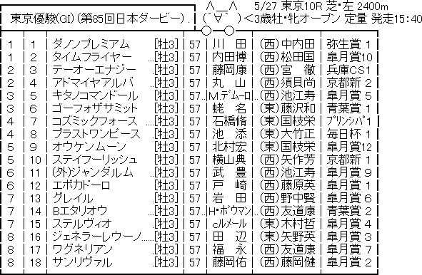 2018.05.26 馬券予想・データkeiba umanami 【競馬予想】[3]第85回日本ダービー(G1)/2018 ツイート シェア Google+ はてブ Pocket 1: 名無しさん@実況で競馬板アウト 2018/05/26(土) 16:33:23.58 ID:K1wsTMoM0 枠 http://jra.jp/keiba/thisweek/2018/0527_1/syutsuba.html 続きを読む Source: ☆うまなみ・競馬にゅーす速報 【競馬予想】[3]第85回日本ダービー(G1)/2018