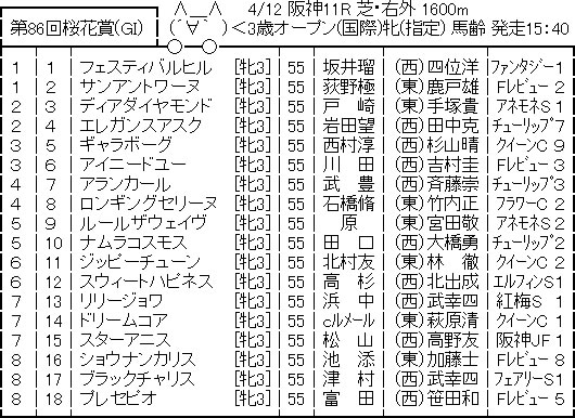2026.04.11 馬券予想・データltdslip2000 【競馬予想】[3]第86回桜花賞(GⅠ)/2026 ツイート シェア Google+ はてブ Pocket 1: 名無しさん@実況で競馬板アウト (ワッチョイW 49e4-qx68) 2026/04/11(土) 17:10:44.04 ID:X05UE6zp0 <div class="t_b"