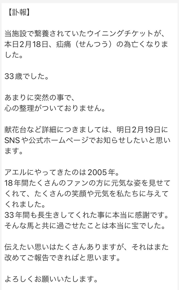 【訃報】ウイニングチケット死す 33歳【ネット反応】