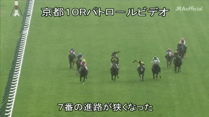 16日の京都10Rは、ゴール手前で5番ケイアイサクソニーが外側に斜行したため、7番セプタリアンの進路が狭くなった。