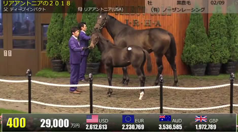 2日目の当歳部門ではこの傾向がより明確になった。最高価格はディープ産駒のリアアントニアの2018(牡=落札者はサトミホースカンパニー)で2億9000万円だったが、 昨年の最高価格のちょうど半額。1億円の大台に乗ったディープ産駒も5頭で、昨年の9頭から大きく減った。