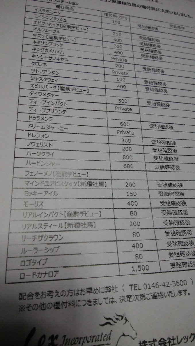 来年の種付け料ロードカナロアは1500万円