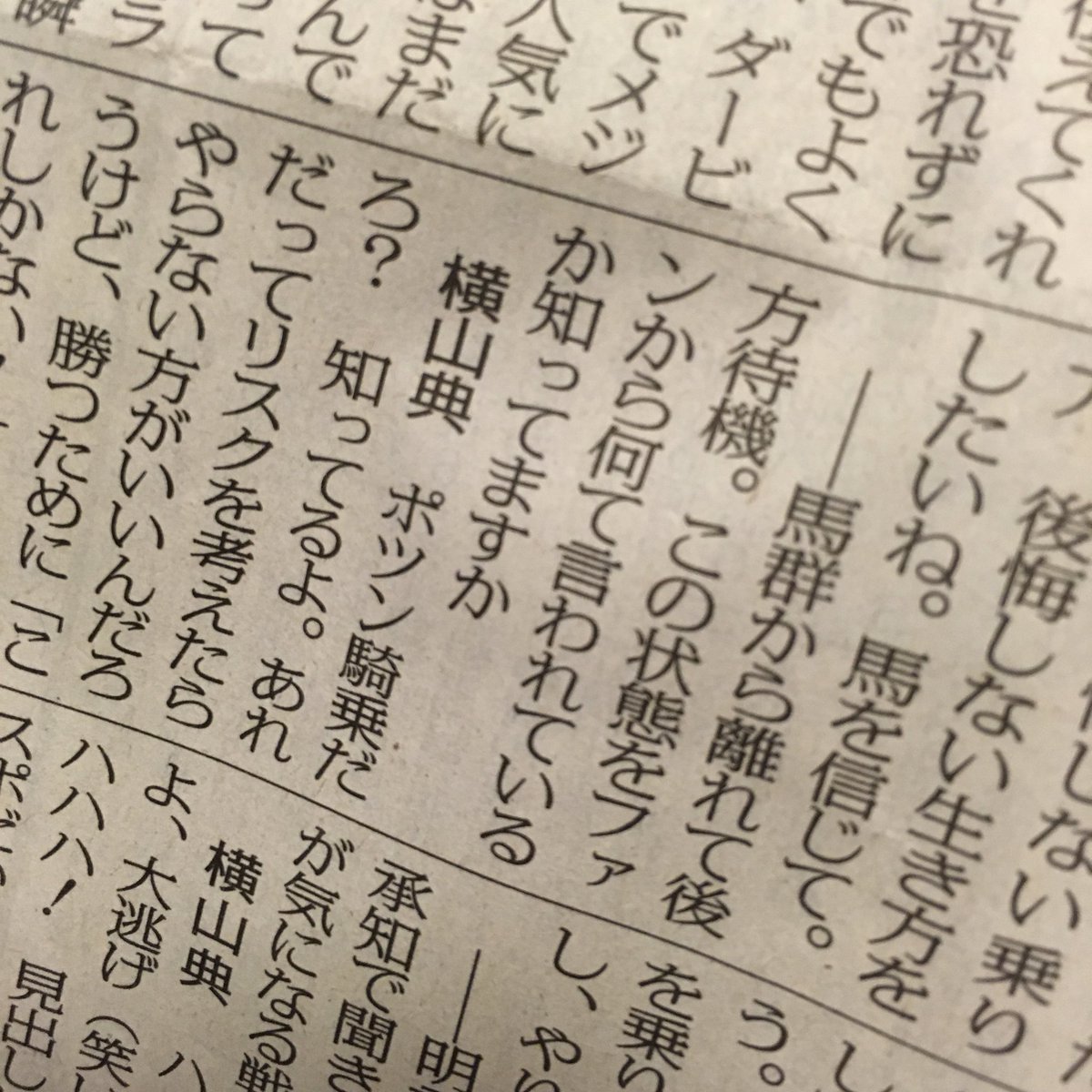 2018.05.11 馬券予想・データkeiba umanami 横山典「ポツン騎乗だろ?知ってるよ」 ツイート シェア Google+ はてブ Pocket 1: 名無しさん@実況で競馬板アウト 2018/05/10(木) 21:59:44.18 ID:dnpPfe860 続きを読む Source: ☆うまなみ・競馬にゅーす速報 横山典「ポツン騎乗だろ?知ってるよ」