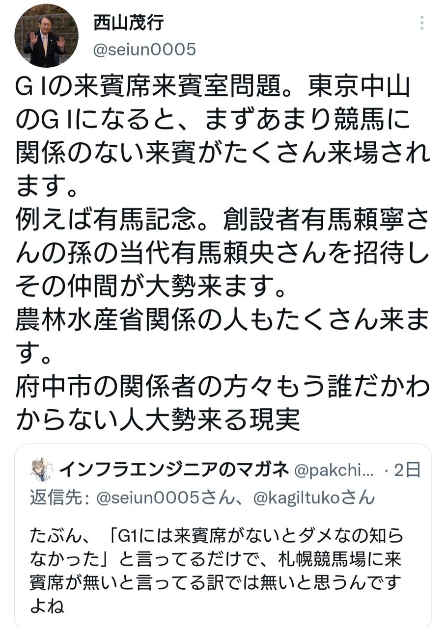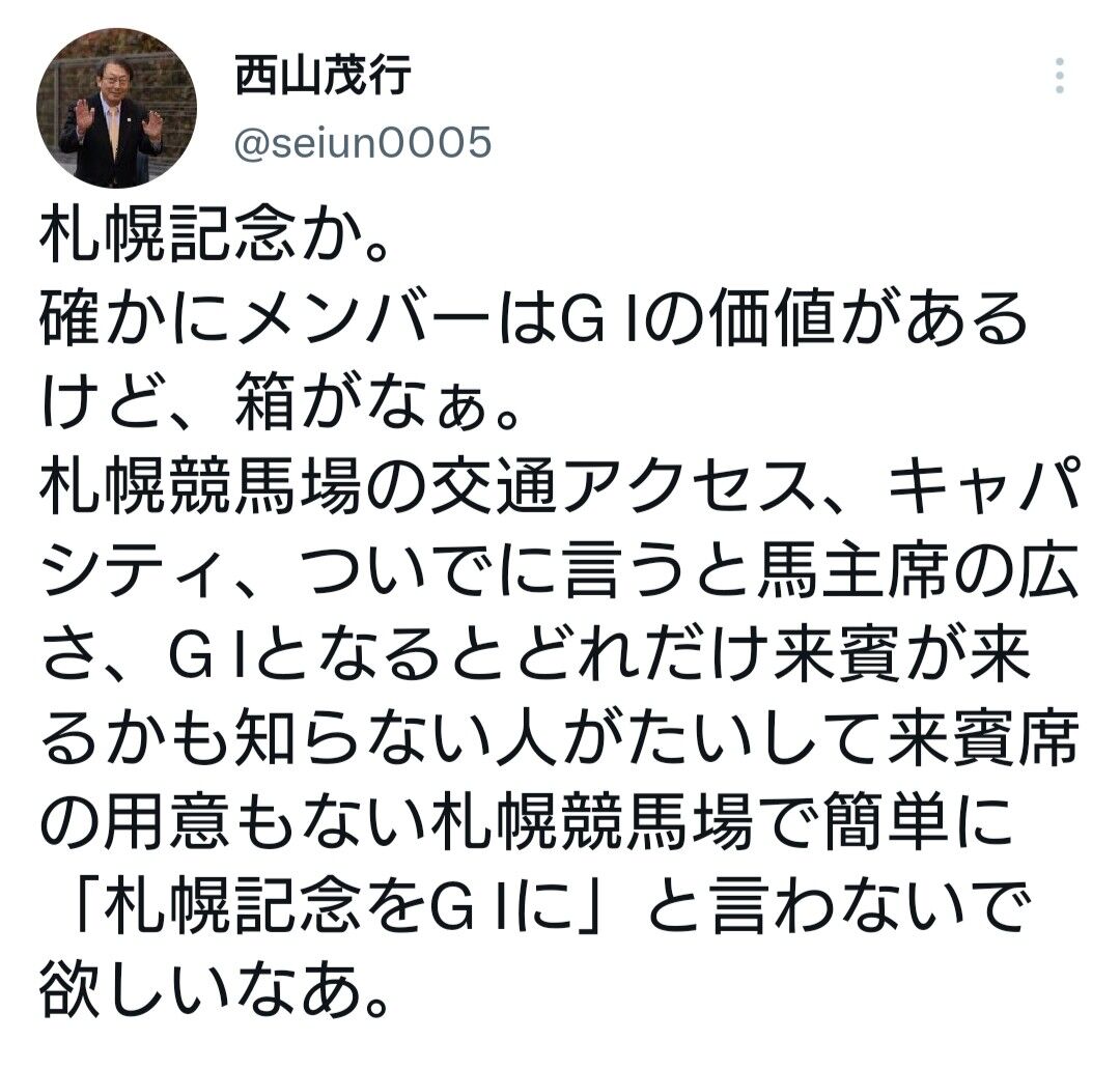 西山オーナーツイート「何も知らない人が札幌記念をG1にとか言わないで」「札幌競馬場の設備や環境でG1は無理」