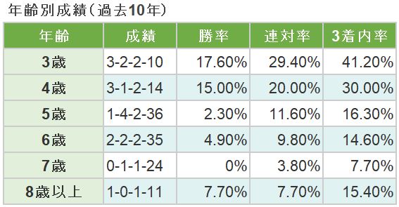 過去10年の年齢別成績をまとめると、「3歳」と「4歳」が連対率で20%以上、3着内率で30%以上を記録している。その他では「7歳」が不振傾向にあるものの、「5歳」・「6歳」・「8歳以上」の各組の間には3着内率で大きな差は見られません。