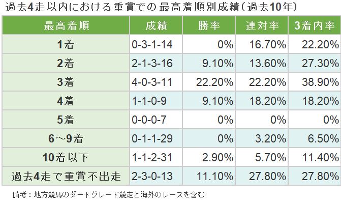 過去10年の出走馬について、過去4走以内における重賞での最高着順別に成績を調べると、「1着」~「3着」と「過去4走で重賞不出走」の計4組が、3着内率で20%を超えています。近走で重賞に出走して上位争いに加わっている実績は重要視したほうが良さそう。ただし、「1着」組から優勝馬が出ていない点は、気になるデータと言えます。。