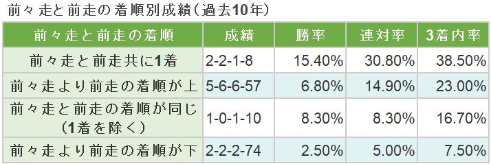 過去10年の出走馬について、前々走と前走との着順別に成績を調べると、好走率が最も高いのは「前々走と前走共に1着」だった馬で、連対率・3着内率でそれに続くのが「前々走より前走の着順が上」組となっています。さらに「前々走と前走の着順が同じ(1着を除く)」組が続いて、「前々走より前走の着順が下」組は好走率が最も低くなっています。連勝中の馬や、前々走から前走で着順を上げている馬の方が、上位争いに加わる可能性が高い傾向があるようです。