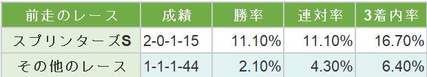 ちなみに、前走の競馬場が「京都、阪神以外の競馬場」だった馬のうち、前走のレースが「スプリンターズS以外のレース」だった馬は3着内率6.4%とさらに苦戦しています。前走が関西圏のレースでもスプリンターズSでもなかった馬は軽視。